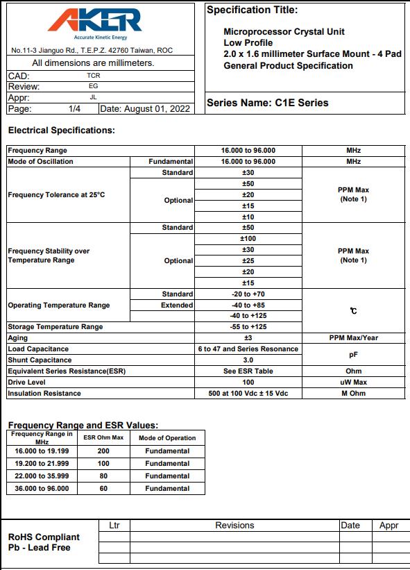 C1E-96.000-8-1216-X2-R,96MHz,2016mm,臺灣AKER安基晶振,參數圖