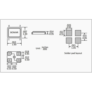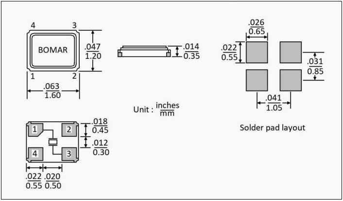 Bomar無源晶振,BC41EFD120-37.400000四腳晶振,無人機信號接收器晶振,美國Bomar晶振公司,進口晶振,歐美晶振,BC63晶振,1612晶振,石英晶振,超小型晶振,無源晶振,貼片晶振,四腳晶振,6G路由器晶振,6G通訊設備晶振,BC63是一款尺寸為1.6 x 1.2 x 0.35mm的超微型陶瓷封裝SMD型晶體,采用四焊片設計。0.35mm的高度和54 MHz的基頻使BC63系列成為眾多應用的絕佳選擇。可能的應用包括藍牙、便攜式個人電腦、個人電腦外圍設備、移動通信和無線通信