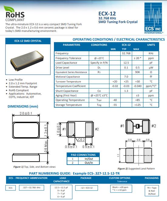| ECS-1.25-12.5-13 | ECS-31 | 125kHz | ±30ppm | 12.5pF | -10°C ~ 60°C |