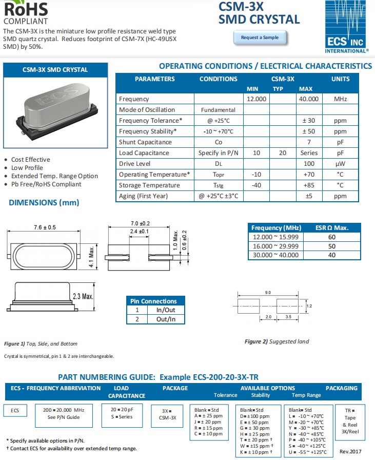伊西斯SMD石英晶體CSM-3X,ECS-286.3-20-3X-EN-TR車載晶振,ECS-184-20-3X-TR,晶體諧振器,ECS伊西斯晶振,美國進(jìn)口晶振,CSM-3X是一種小型低輪廓電阻焊縫型SMD石英晶體,將CSM-7X(HC-49USX SMD)的占用空間減少50%。石英晶體諧振器,ECS-120-20-3X-TR無源晶振,ECS-147.4-20-3X-TR石英晶振,兩腳貼片晶振,ECS-120-20-3X-EN-TR無鉛環(huán)保晶振,頻率范圍:12MHz~40MHz,小體積,輕薄型,耐熱及耐環(huán)境特點(diǎn),SMD石英晶振適用于移動(dòng)通訊設(shè)備,無線網(wǎng)絡(luò)晶振,藍(lán)牙模塊晶振,汽車電子晶振,車載晶振,數(shù)碼電子晶振,安防設(shè)備,智能家居,物聯(lián)網(wǎng)等應(yīng)用。