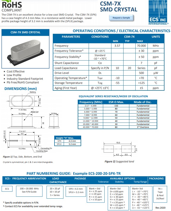 | ECS-200-20-5PX-TR | ECS Crystal | CSM-7X | 20MHz | -10°C ~ 70°C |