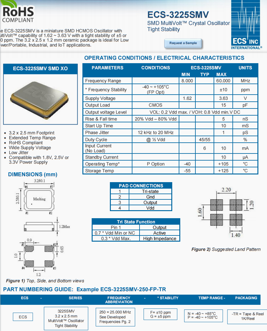 ECS-3225SMV-250-FP-TR晶振,進口ECS有源晶振,醫療設備晶振,美國ECS晶振公司,伊西斯無源晶振,ECS-3225SMV-250-FP-TR晶振,25MHz晶振,3225晶振,超小型晶振,四腳貼片晶振,石英晶體諧振器,美國進口晶振,高精度晶振,耐高溫晶振,汽車電子晶振,工業設備晶振,物聯網晶振,COTS晶振.ECS-3225SMV是一款微型SMD HCMOS振蕩器,MultiVolt™能力為1.62 ~ 3.63 V,穩定性為±5或±10 ppm。3.2 x 2.5 x 1.2 mm陶瓷封裝是低功耗/便攜式,工業和物聯網應用的理想選擇。