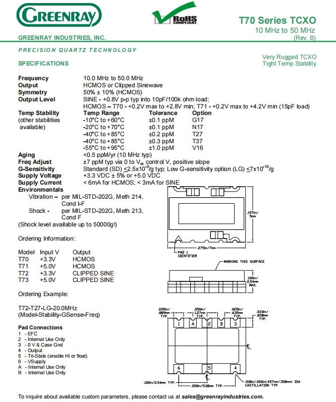 格林雷晶振,T70-N17-LG-10.0MHz-E溫補晶振,6G通訊衛星晶振,美國Greenray晶振公司,歐美晶振,石英晶振,Greenray Industries的T70系列tcxo為移動,電池供電的應用程序提供可靠,精確的性能。它已被開發為關鍵時序的參考振蕩器,需要嚴格的溫度穩定性,低電源電流,非常堅固的封裝,占地面積小。T70系列非常適合用于勘探和跟蹤設備應用。特點:小巧堅固的7.0 x 5.0 mm封裝,可承受高達50,000 g的振動和高沖擊,嚴格的溫度穩定性低至±0.1ppm, 10年以上的長期老化< 5ppm,低加速靈敏度:< 0.7 ppb/g,低功耗,實現可靠的電池供電性能提升,低相位噪聲。應用,電信,高沖擊電子,移動無線電,移動儀器,機載通信,無線通信,微波接收器,智能彈藥,貼片晶振,有源晶振,TCXO晶振,八腳晶振,高精度晶振,進口晶振,6G無線通信晶振,