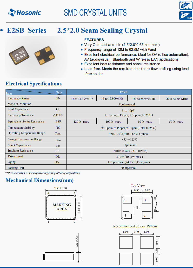 E2SB40E00000JE  Hosonic晶振 E2SB 40 MHz ±7ppm ±10ppm 12pF  -30°C ~ 85°C