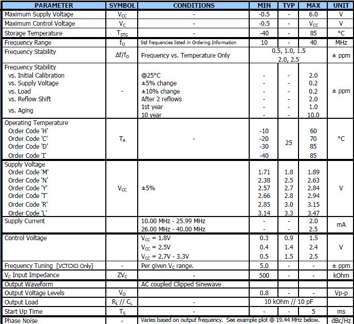 頻率精度高0.5 PPM-2.0 PPM,工作溫度范圍:-30度至85度,電源電壓:1.8V-3.3V之間可供選擇,剪正弦波輸出,可選電壓控制頻率調諧(VCTCXO),3.2 mmx2.5mm表面安裝包,頻率范圍10 - 40 MHz(標準頻率列表所示),基本晶體設計,頻率穩定度,幾個選項可供選擇±0.5 ppm ~±2.5 ppm,操作電壓,+ 1.8 vdc ~ + 3.3伏直流.操作溫度為-40°C + 85°C,磁帶和卷軸包裝,符合RoHS /綠(6/6).