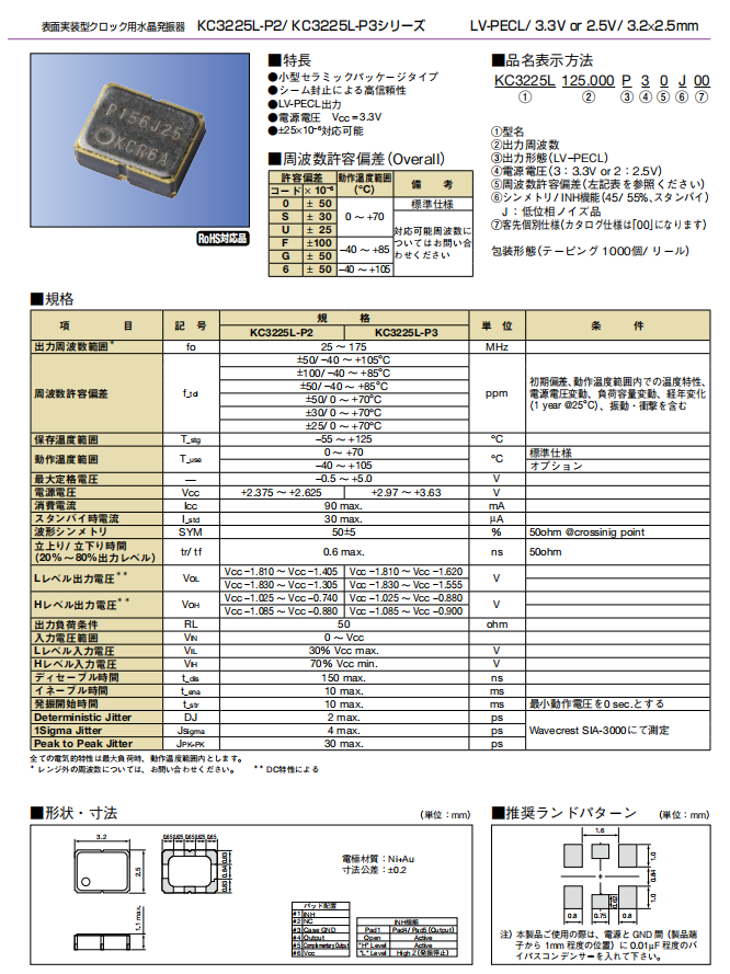 | KC3225A125.000C30E00 | AVX Corp/Kyocera Corp | KC3225A-C3, Kyocera | 125MHz | 3.3V | -10°C ~ 70°C |