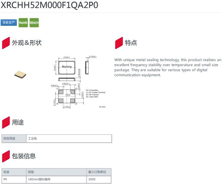 XRCHH52M000F1QA2P0|52M|-30~85℃|10ppm|8pf ,XRCHH52M000F1QA2P0晶振,頻率52M,工作溫度-30~85℃,精度10ppm,負載8pf,2520mm小體積晶振,金屬密封包裝晶振,數(shù)字通信設(shè)備晶振,醫(yī)療設(shè)備晶振,智能家具晶振,藍牙模塊晶振.