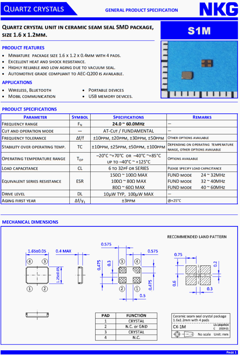 NKG高品質晶振,汽車多媒體系統晶振,S1M25.0000F18E23-EXT超小型晶振,NKG晶振公司,無源晶振,貼片晶振,超小型晶振,1612晶振,汽車多媒體設備晶振,6G通訊設備晶振,6G網絡終端晶振,無源晶振,貼片晶振。石英晶體單元在陶瓷縫密封SMD封裝,尺寸1.6 x 1.2mm。產品特點:微型包裝尺寸1.6 x 1.2 x 0.4mm,有4個襯墊。優異的耐熱性和抗震性。真空密封,可靠性高,老化率低。符合AEC-Q200標準的汽車級產品可供選擇。應用范圍:無線、藍牙、移動通訊、便攜設備、USB存儲設備