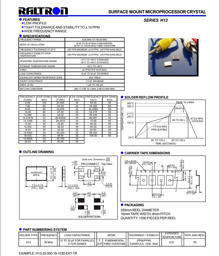 - 產(chǎn)品描述:H13-13.000-16-5050-EXT-TR晶振,Raltron無(wú)源晶振,7050mm晶振,頻率13.000MHz,負(fù)載16pf,工作溫度-40~85°C,石英晶體諧振器,四腳貼片晶振,歐美進(jìn)口晶振,高精度晶振,數(shù)碼相機(jī)晶振,儲(chǔ)存卡晶振,家電影音系統(tǒng)晶振,電子體重秤...