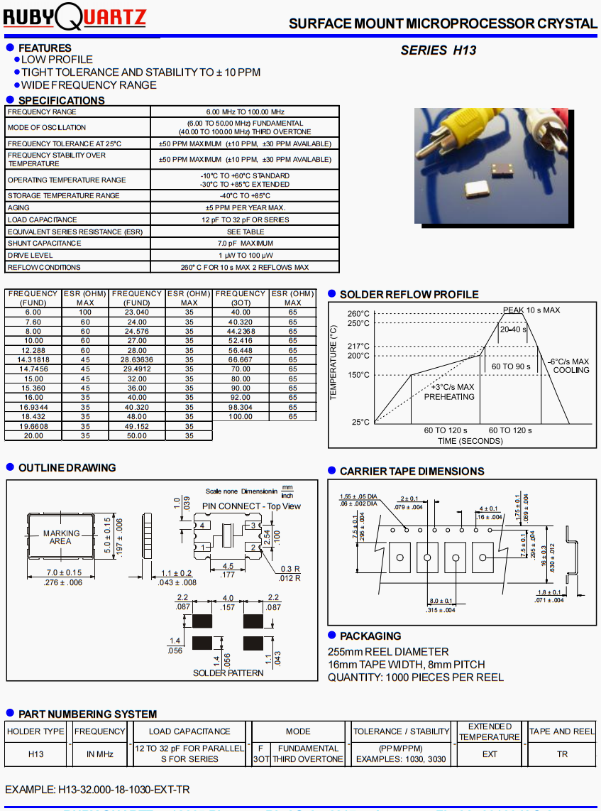 H13-32.000-18-1030-EXT-TR晶振,歐美rubyquartz晶體,耐高溫汽車晶振,美國盧柏晶振公司,高精度晶振,無源晶振,貼片晶振,高精度晶振,6G通訊設備晶振,無線傳輸晶振,局域網晶振,7050晶振,高品質晶振,SMD晶振,石英晶振,小體積晶振,低損耗晶振 ,北斗衛星定位模塊晶振,6G無線網晶振,高精度晶振。表面貼裝微處理器晶體,低輪廓,嚴格的公差和穩定性到±10ppm,寬頻率范圍。