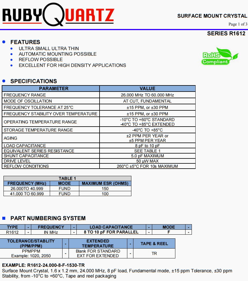 R1612-20.000-8-F-1530-TR晶振,rubyquartz超小型晶體,宇宙空間站晶振,美國rubyquartz晶振公司,高精度晶振,無源晶振,貼片晶振,高精度晶振,6G通訊設備晶振,無線傳輸晶振,局域網晶振,5032晶振,高品質晶振,SMD晶振,石英晶振,小體積晶振,低損耗晶振 ,北斗衛星定位模塊晶振,6G無線網晶振,高精度晶振。特點:超小型超薄,可自動安裝,可回流,適用于高密度應用,應用:尋呼機,無繩電話,GPS,藍牙