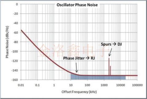 圖3顯示了相位噪聲特性與相位抖動之間的關系.總抖動(TJ)是確定性抖動(DJ)與隨機抖動(RJ)的總和.在具有如圖3所示的晶振相位噪聲特性的系統中,代表通信環路帶寬(RJ)(圖3中的藍色部分)的12k-20MHz范圍的積分值之和代表雜散的總抖動(DJ).