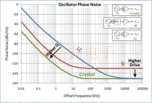 首先,在載波附近(低頻帶側)的斜率梯度的差異很大程度上取決于振蕩源的Q值.Q值特別高的晶體具有高達100kHz的偏移頻率的低相位噪聲特性,而LC振蕩的Q值不超過100的極低的LC振蕩特性在載波附近(低頻段)具有方面)趨于惡化.相反,無論振蕩源如何,斜率的高頻帶側都很大程度上受到電路發射噪聲的影響.這樣,當信號元素大于噪聲元素時,地板水平趨于降低.尤其是LC振蕩具有大的輸出幅度和顯著的信號強度,因此在高頻帶側相位噪聲趨于減小.相比之下,可施加到Si諧振器的功率有限制,導致輸出幅度小和信號強度弱,與諧振器或LC振蕩相比,它們在高頻段一側的理想度降低.當然,降低高頻帶側的相位噪聲的另一種方法將是增加功率消耗,從而增加信號強度并降低地板水平.這種方法在改善相位噪聲與保持低功耗之間產生了相互取舍.