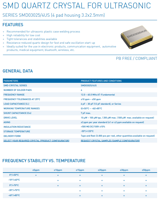 適用于超聲波的SMD03025/4US系列的SMD石英可以用超聲波焊接和清洗。為此,該石英(其石英諧振器具有特殊的固定超聲波極限)被設計用于15 KHz、20 KHz、35 KHz和40 KHz的超聲波頻率。