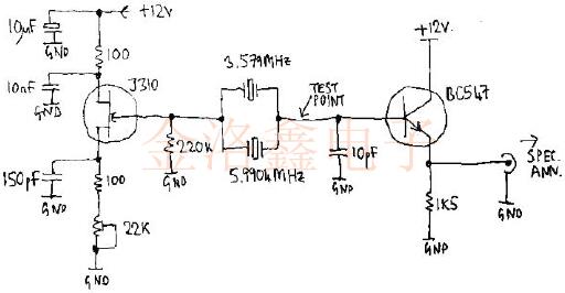 首先,忽略右側的緩沖電路.忽略標記為“測試點”的箭頭右側的所有內容,12V電源連接處添加了10uF電容器,只是因為對連接到電源的較長(可能為1m或更長)雙芯電纜感到內gui.首先使用的兩個晶體諧振器是3.579MHz晶體和5.9904MHz晶體,它們在HC49盒中都使用了舊的殼.但是可以調節22K微調電位器,并在不同的設置下,一個或另一個,或者看似兩個晶體都會振蕩.