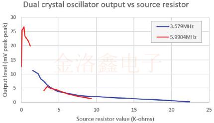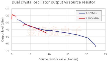 紅線是5.9904MHz,藍線是3.579MHz.在較低的電阻值下,您可以清楚地看到5.9904MHz晶體振蕩.高于1.5K時,將接管3.579MHz晶體.從大約3K到10K,兩個晶體同時振蕩.這兩個頻率的水平令人驚訝地相似.高于10K時,僅3.579MHz晶體振蕩.
