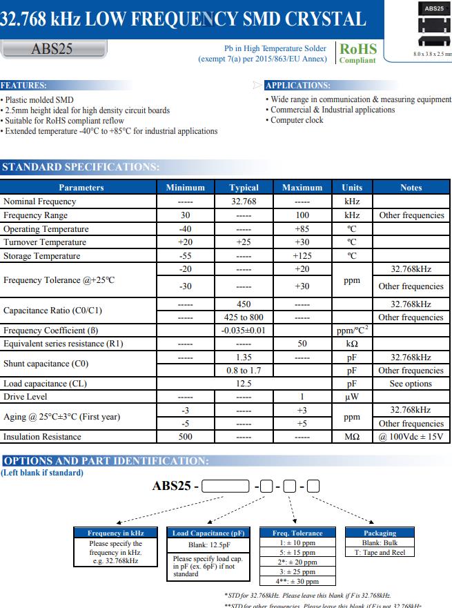 | ABS25-32.000KHZ-T | Abracon晶振 | ABS25 | kHz Crystal (Tuning Fork) | 32kHz | 4-SOJ, 5.50mm pitch |