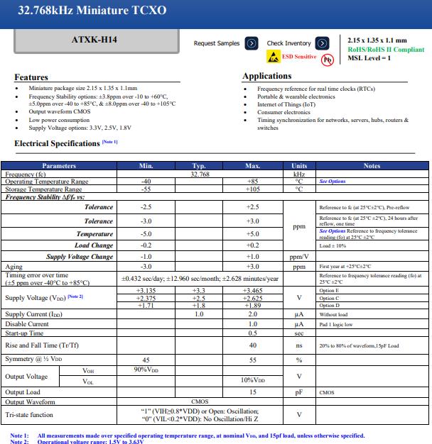 Abracon的ATXK-H14溫補晶振廣泛用于便攜式和可穿戴電子產品,ATXK-H14有源晶振特征