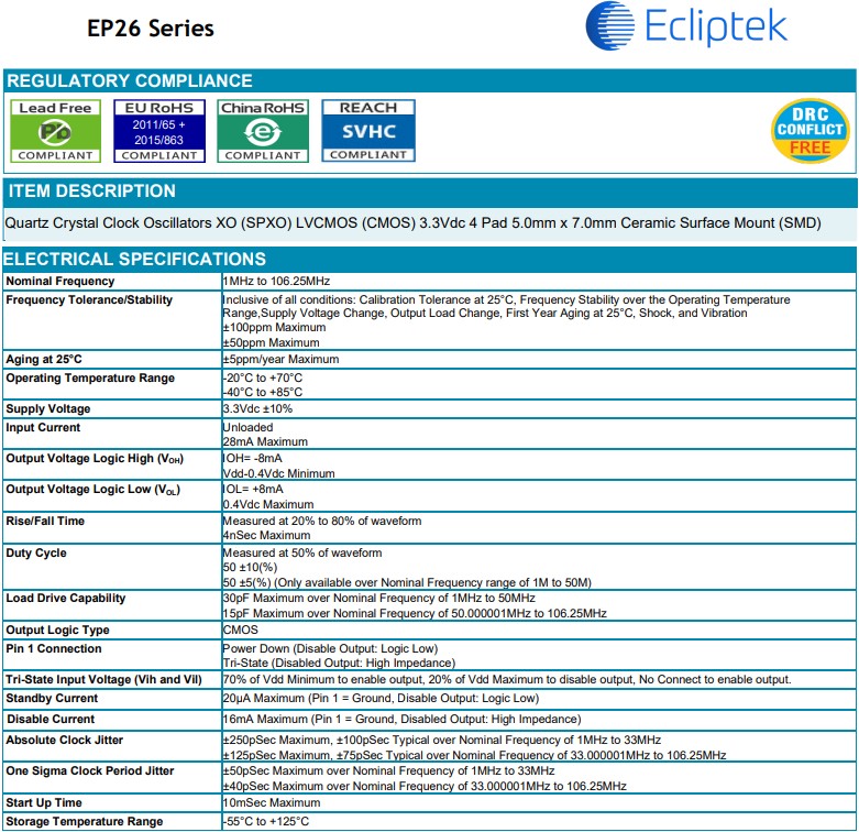 Ecliptek日蝕晶振公司成立于1987年,是一家石英晶振晶體,貼片晶振頻率元件控制市場上公認的領(lǐng)導者.日蝕晶振公司擁有先進的產(chǎn)品和領(lǐng)先的技術(shù)使我們能夠為客戶提供最好的石英晶體,貼片晶振,石英水晶和有源晶振,石英晶體振蕩器,貼片振蕩器產(chǎn)品.日蝕晶振EP26系列,編碼EP2600TS-40.000M,石英晶體時鐘振蕩器