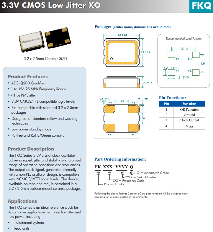 應用:FKQ 系列是需要低抖動和低功耗的汽車應用的理想參考時鐘,包括:信息娛樂系統,主機