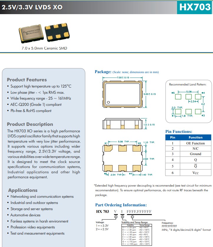 7050mm體積非常小的SMD晶振器件,是民用小型無線數碼產品的最佳選擇,小體積晶振被廣泛應用到,手機藍牙,GPS定位系統,無線通訊集,高精度和高頻率的穩定性能,非常好的減少電磁干擾的影響,是民用無線數碼產品最好的選擇,符合RoHS/無鉛. HX703系列滿足通信系統和其他高性能設備的時鐘源規范,HX7011C0050.000000,LVDS晶振,ECERA晶振