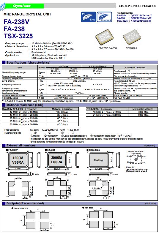 | Q22FA2380116216 | 3.2 x 2.5 x 0.7mm | FA-238 | 22.579200 MHz | 7.5 pF | +/-50 ppm | +/-30 ppm | -20 to +70 °C | ≤ 60 Ω |