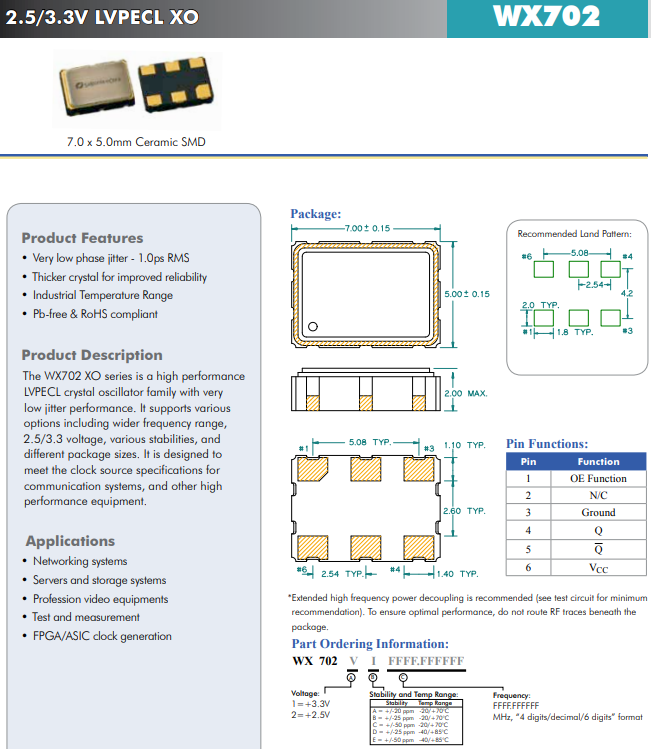 | WX702 | 標準 | PECL | 3.32.5 | 20~50 | 50 至 212.5 | <1 | 6 | - | 2.5V/3.3V、7.0x5.0mm、PLL LVPECL 晶體振蕩器 |