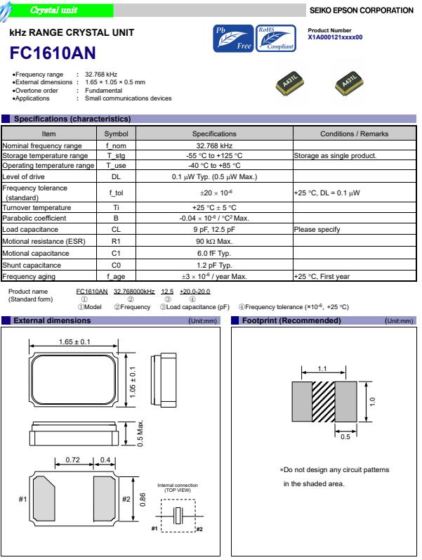 | X1A000121001100 | 1.65 x 1.05 x 0.5 mm | FC1610AN | 32.768kHz | 9 pF | +/-10.0 ppm | -40 to +85 °C |