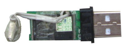 下圖是已經(jīng)修好的優(yōu)盤,因為后換的晶振較大,我用細導線(來自40線硬盤傳輸線)引出,并膠帶包裹絕緣后放在尾部,將尾蓋里的塑料稍去掉一點正好可以合上。