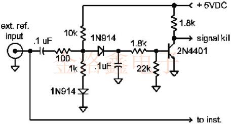 信號(hào)殺死輸入通常接受普通的TTL電平,但可以輕松配置為自定義開(kāi)關(guān)電平.大多數(shù)信號(hào)殺死輸入均設(shè)計(jì)為在末連接時(shí)浮動(dòng)至"開(kāi)"狀態(tài),內(nèi)部RC電路可保護(hù)晶振免受可能存在于控制線(xiàn)上有有害電壓或干擾RF信號(hào)的侵害.下面顯示的電路將檢測(cè)到存在大于1伏pp的外部基準(zhǔn),并產(chǎn)生適合驅(qū)動(dòng)大多數(shù)信號(hào)殺死輸入的邏輯"低".該控制信號(hào)還可用于門(mén)控儀器電路的外部輸入.該電路設(shè)計(jì)為表現(xiàn)出相當(dāng)高的輸入阻抗,因此在儀器的其他位置假設(shè)電纜端接正確. 如果期望內(nèi)部振蕩器具有比外部基準(zhǔn)更好的短期穩(wěn)定性,則可能需要將內(nèi)部振蕩器相位鎖定到基準(zhǔn).鎖定的振蕩器將表現(xiàn)出內(nèi)部晶體振蕩器的良好短期穩(wěn)定性和外部基準(zhǔn)的良好長(zhǎng)期穩(wěn)定性.一個(gè)簡(jiǎn)單的一階環(huán)路可以由三態(tài)總線(xiàn)設(shè)備或模擬開(kāi)關(guān)以及一些其他部件組成.基本概念是利用外部參考信號(hào)驅(qū)動(dòng)三態(tài)控制,并使內(nèi)部振蕩器信號(hào)通過(guò)三態(tài)門(mén)之一,以便參考信號(hào)對(duì)內(nèi)部振蕩器信號(hào)進(jìn)行采樣.三態(tài)門(mén)的輸出經(jīng)過(guò)低通濾波以消除RF頻率,并連接到內(nèi)部振蕩器的電調(diào)諧.偏置三態(tài)控制線(xiàn),以便在沒(méi)有外部基準(zhǔn)時(shí)柵極輸出"浮動(dòng)".當(dāng)沒(méi)有外部參考源時(shí),這種高阻抗?fàn)顟B(tài)允許調(diào)諧線(xiàn)被連接到調(diào)諧電位器的高阻值電阻拉動(dòng).74HC244具有兩組四個(gè)三態(tài)緩沖器,是一個(gè)不錯(cuò)的選擇,因?yàn)榭梢允褂梦词褂玫乃膫€(gè)門(mén)來(lái)緩沖信號(hào).