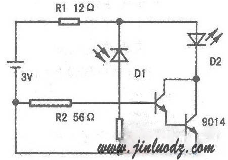 下圖的電路非常簡潔,2只NPN三極管組成復合管用于放大被測的遙控器紅外光信號,D1用扁平紅外線光敏二極管,D2用紅色圓型發光二極管,Rl為D2限流電阻,R2為遙控器上IC輸出限流電阻,R3與Dl組成分壓電路目的是泄掉Dl的反向穿透電流。如沒有R3,D2將長亮。電阻可使用1/8W的。