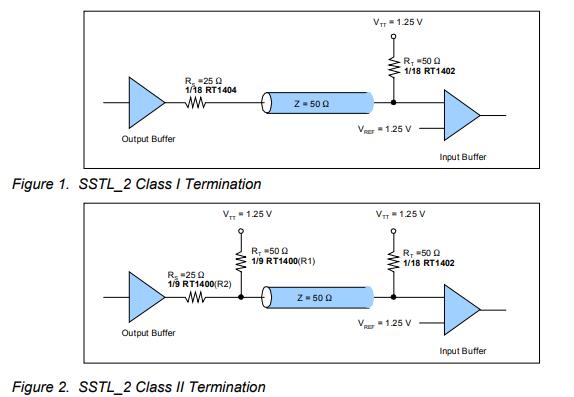 所需的終止樣式基于DDR內(nèi)存應(yīng)用程序。滿(mǎn)足EIA/JEDEC標(biāo)準(zhǔn)JESD8-9A正確信號(hào)處理要求的兩類(lèi)終端如圖1和圖2所示。在0-2.5伏邏輯交換范圍內(nèi)工作的2.5VI/O存儲(chǔ)器總線(xiàn)標(biāo)準(zhǔn)是SSTL_2,該標(biāo)準(zhǔn)適用于高速DDRSDRAM接口。DDR本質(zhì)上不需要提高時(shí)鐘頻率就能加倍提高SDRAM的速度,它允許在時(shí)鐘脈沖的上升沿和下降沿讀出數(shù)據(jù),因而其速度是標(biāo)準(zhǔn)SDRAM的兩倍.