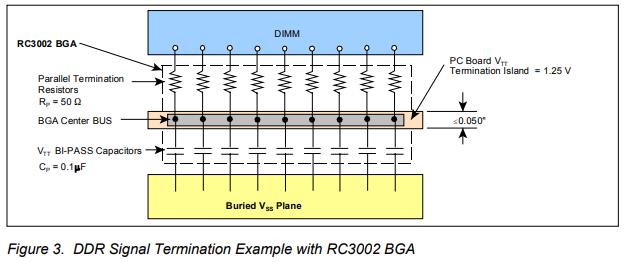 終端電阻應(yīng)盡可能靠近雙列直插式內(nèi)存模塊(DIMM)插槽,以最大限度地減少信號(hào)路由長(zhǎng)度。如果使用電阻陣列或僅帶終端電阻的BGA網(wǎng)絡(luò),雙通電容應(yīng)放置在VTT終端島和VSS平面之間,每?jī)蓚€(gè)終端電阻至少有一個(gè)0.01μF電容,間隔均勻。采用任何一種端接方法,PCB應(yīng)在端接島的每端包含一個(gè)10μF鉭電容,用于批量去耦。圖3顯示了采用帶終端電阻和雙極電容的BGA封裝的完整終端解決方案示例。