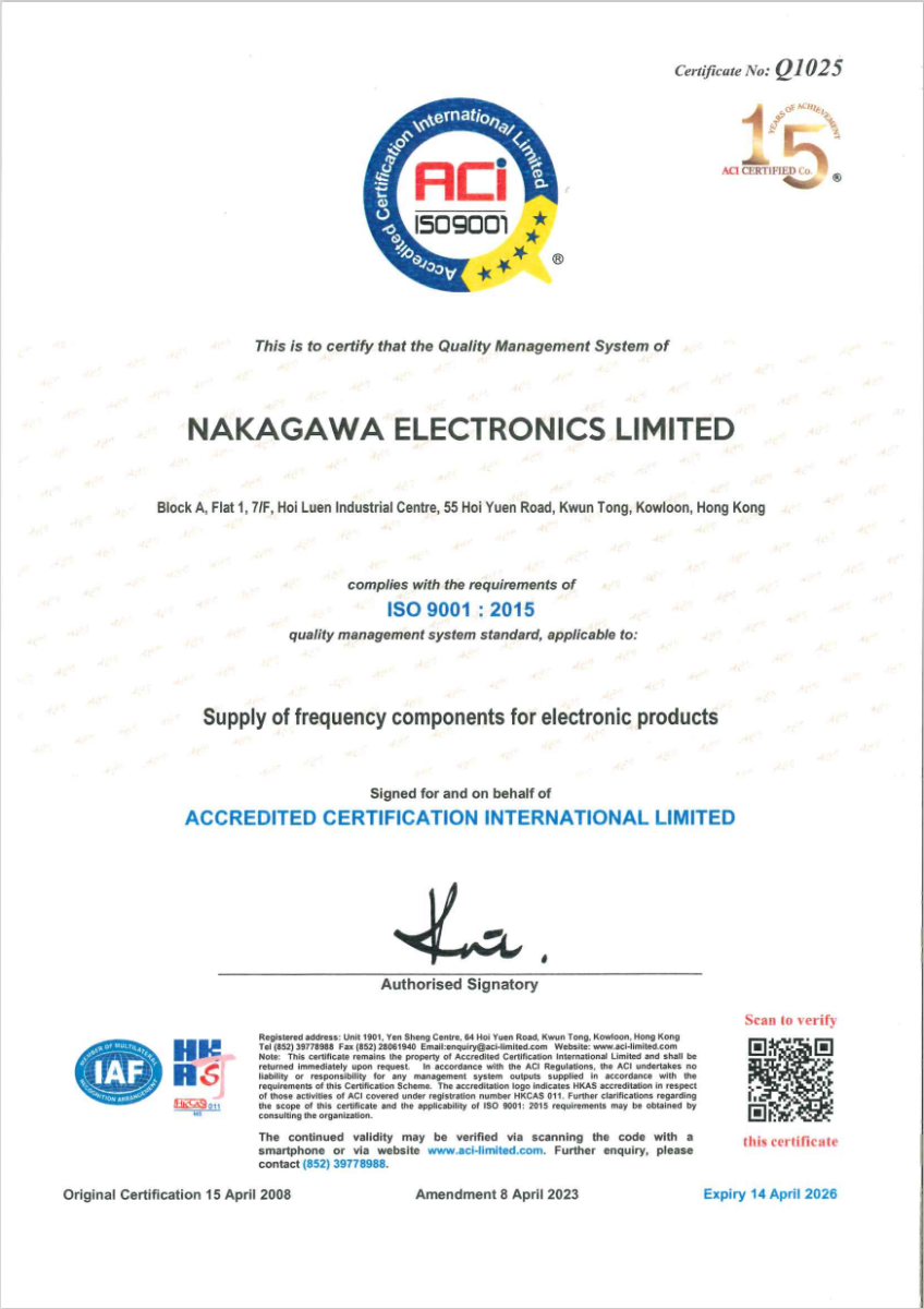 NAKAGAWA ELECTRONICS LIMITED (NKG晶振)致力于提供高質量的產品,并因此維護質量和管理體系,以確保能夠保證這一點。不僅對我們的客戶,而且對我們自己的員工和社區,我們以最高的法律和道德標準協調我們的所有活動,履行社會責任。我們公司的運作是參照相關的企業管治準則和包括EICC行為準則在內的國際標準來制定和更新的。中川電子有限公司(NKG)香港總部以ISO 9001為基礎運作生產石英晶體諧振器,并定期接受審核。您可以在這里查看證書。我們的生產基地除了擁有兩個體系資質外,還擁有更先進的設置,涵蓋了TS 16949和全面的健康和安全程序(基于OHSAS要求)。除了強制性的內部XRF測試(基于QC080000模型)外,工廠還運行了一個擴展系統,以確保我們的產品符合環境要求。