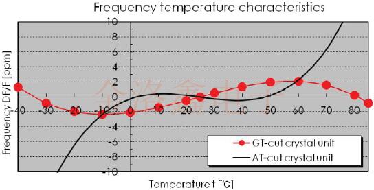 2.在廣泛的溫度范圍內保持穩定的頻率GT切割石英晶體單元以其卓越的頻率溫度特性而聞名(圖2).這種發展產生了AT切割石英晶體單元無法提供的,在−20至+70℃范圍內具有±3ppm和在−40至+85℃范圍內具有±5ppm的出色值的單元. 3.可以低功率驅動
